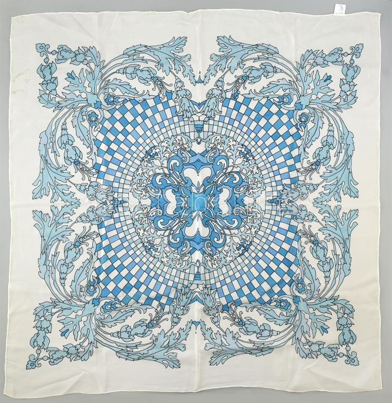 Beschreibung: Fehér alapon világoskék mintás kendő, kézzel szegett, jelzett, 100% Silk, kb. 88x88 cm