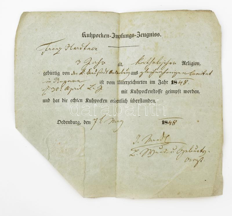 1848 Sopron, tehénhimlő oltási bizonyítvány, német nyelven, pecséttel,... https://www.darabanth.com/de/447-Fernauktion/447.0/Kunst-Dokumente-andere-Sammelgebiete/Dokument~2000110/1848-Sopron-tehenhimlo-oltasi-bizonyitvany-nemet-nyelven-pecsettel-hajtott-kisse-foltos~II2964209