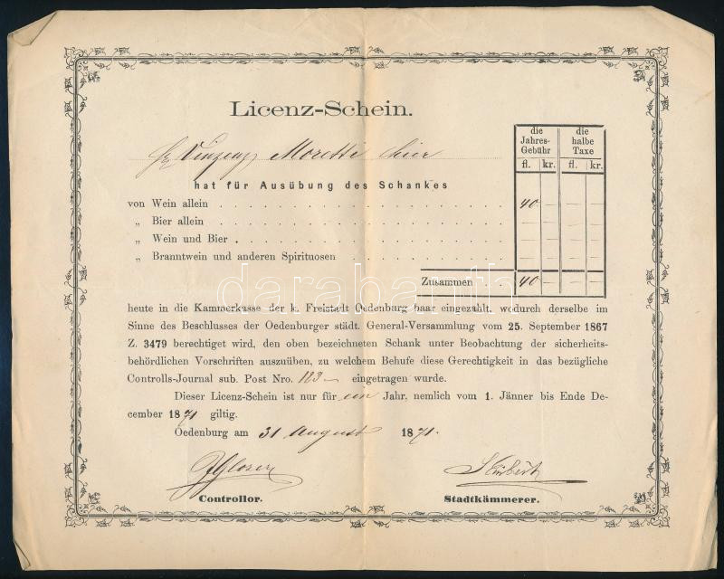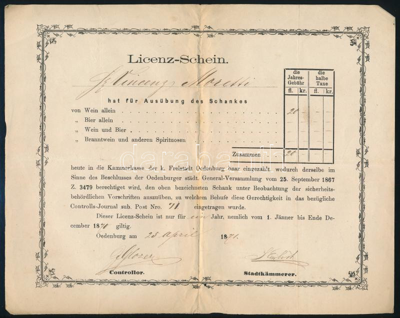 1871 Sopron 2 db kocsmai engedély bizonylat, borra, német nyelven, alá... https://www.darabanth.com/de/447-Fernauktion/447.0/Kunst-Dokumente-andere-Sammelgebiete/Dokument~2000110/1871-Sopron-2-db-kocsmai-engedely-bizonylat-borra-nemet-nyelven-alairasokkal-hajtott-~II2964185