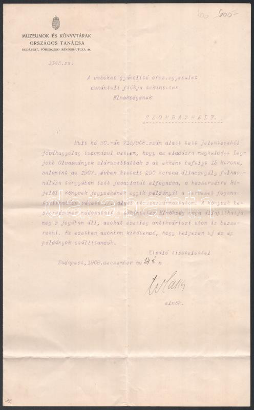 Beschreibung: 1908 Báró zalánkeméni Wlassics Gyula (1884-1962) író, jogtudos autográf aláírása Muzeumok és Könyvtárak Országos Tanácsa fejléces papírján.
