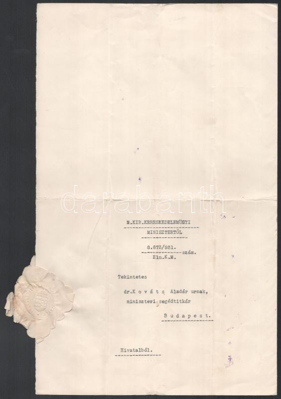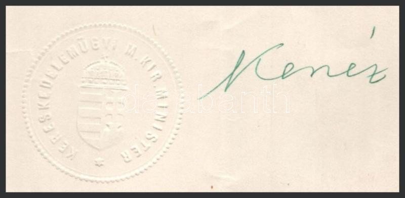 1931 Bp., Kenéz Béla (1874-1946) kereskedelemügyi miniszter autográf aláírása Dr. Kováts Aladár miniszteri segédtitkár részére szóló titkári kinevezésen, szárazbélyegzővel