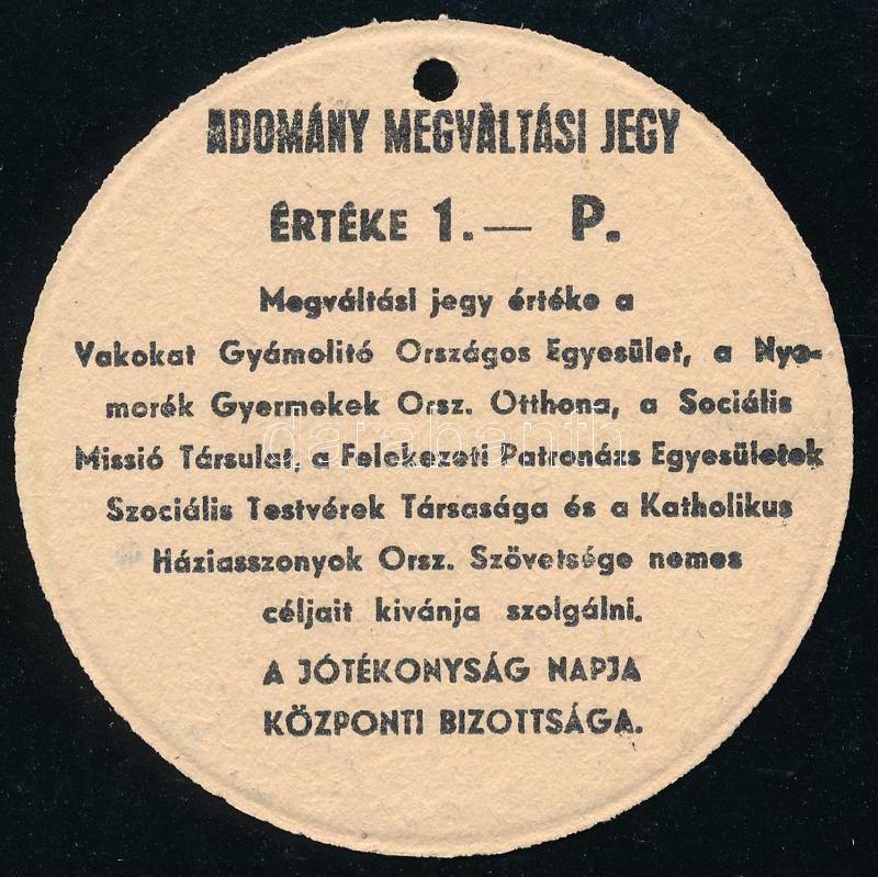 Beschreibung: 1939 Jótékonyság Napja 1939. nov. 1-2., 1P értékű adomány megváltási jegy