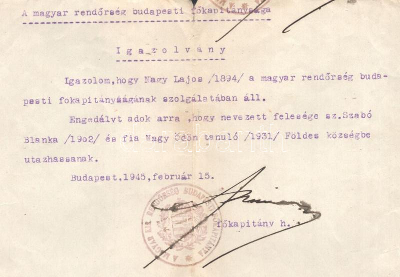 Beschreibung: 1945 febr. 15. korai magyar-orosz kétnyelvű rendőrségi igazolvány Budapestről