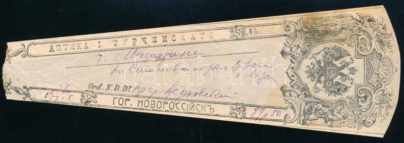 cca 1910 Orosz gyógyszertári recept a cári időkből 22 cm / Russian pha... https://www.darabanth.com/de/447-Fernauktion/447.0/Kunst-Dokumente-andere-Sammelgebiete/Dokument~2000110/cca-1910-Orosz-gyogyszertari-recept-a-cari-idokbol-22-cm-Russian-pharmacy-prescription~II2908516