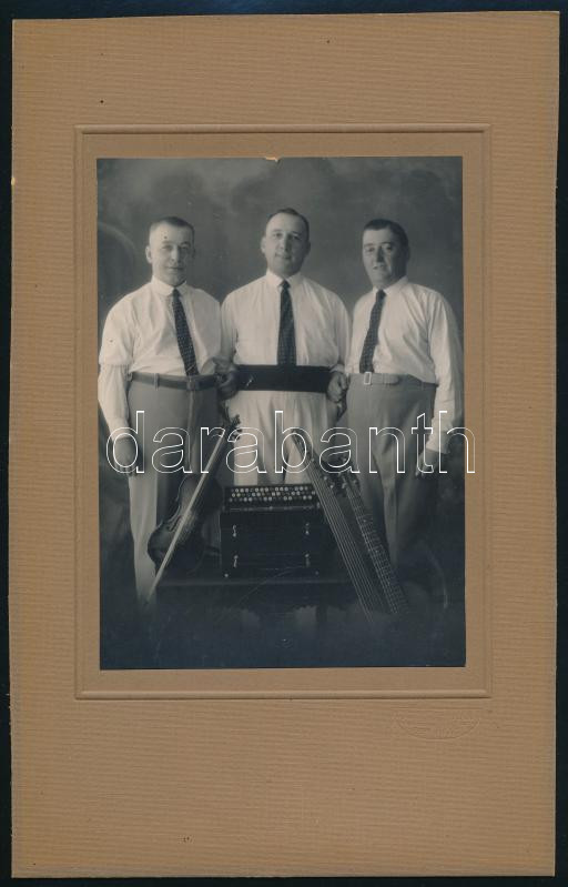 cca 1920-1940 Zenésztrió hangszerekkel (hegedű, harmonika, duplanyakú ... https://www.darabanth.com/de/447-Fernauktion/447.0/Kunst-Dokumente-andere-Sammelgebiete/Dokument~2000110/cca-1920-1940-Zenesztrio-hangszerekkel-hegedu-harmonika-duplanyaku-gitar-foto-kartonon-h~II2963226