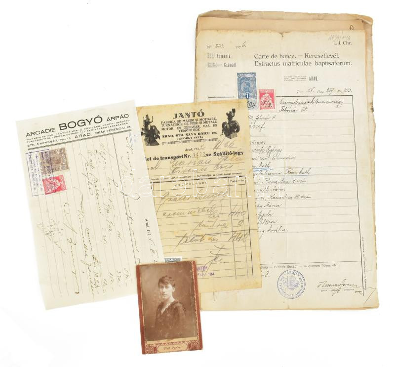 Beschreibung: cca 1930 Aradi személy irat és fotó hagyatéka: számlák, keresztlevél, fotó. össz 8 db