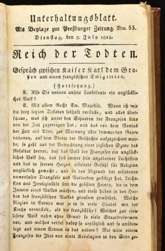 1814 Unterhaltungsblatt für die Leser der Pressburger Zeitung. Zweite Jahreshälfte 1814. Pressburg [Pozsony], S. P. Weber und Sohn. A Pressburger Zeitung c. pozsonyi német nyelvű lap mellékletének egybekötött számai (1814. második félév). Aranyozott gerincű egészbőr-kötésben, foltos lapokkal, egy-két sérült lappal.