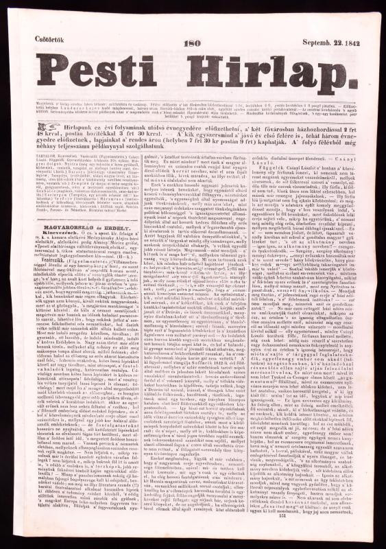 1842 Pesti Hírlap 180. sz. Septemb. 22. 1842. Szerk.: Kossuth Lajos. Pest, Landerer Lajos, javított gerinccel, hajtásnyommal, 671-678 p. Benne korabeli hírekkel, érdekes írásokkal, korabeli reklámokkal, gőzhajómenetrendekkel, gabonaárakkal.