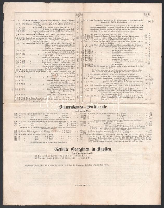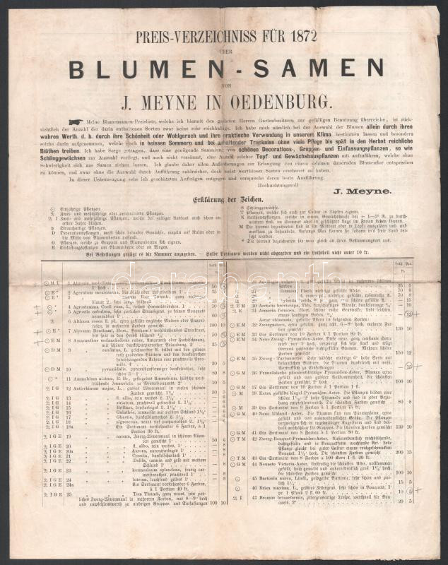 1872 Oedenburg (Sopron), J. Meyne: Preis-Verzeichniss für 1872 über Blumen - Samen von J. Meyne in Oedenburg, Ungarn. Wien, E. Jesper-ny., foltos, hajtott, bejelölésekkel, 2 sztl. lev. Német nyelvű virágmag árjegyzék.