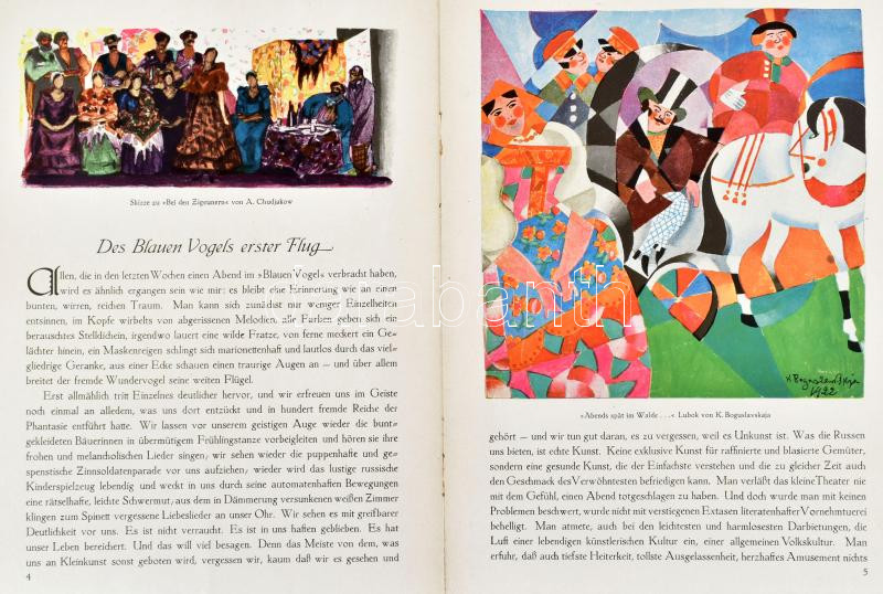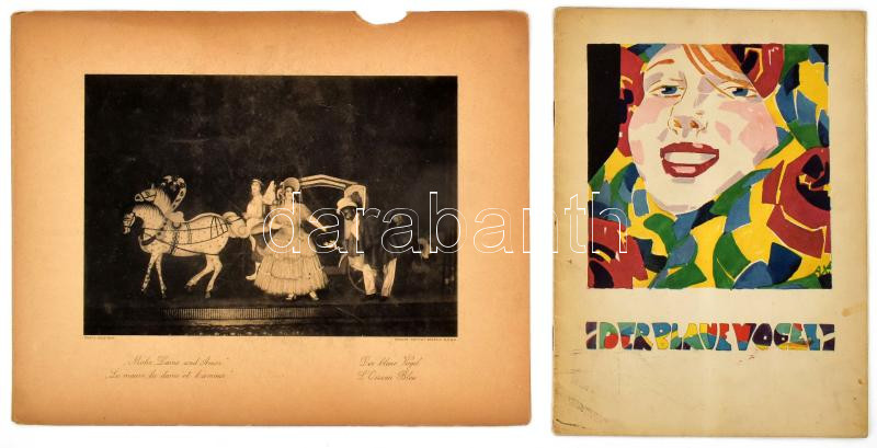 1922 Der blaue Vogel, Zweites Heft, Februar 1922. Német nyelvű színházi, művészeti folyóirat, fekete-fehér és színes képekkel. Kiadói tűzött papírkötés, sérült, középen hajtásnyommal, több kijáró lappal. + 2 db fekete-fehér képmelléklet, lapszéli sérüléssel, lapméret: 25,5x32 cm