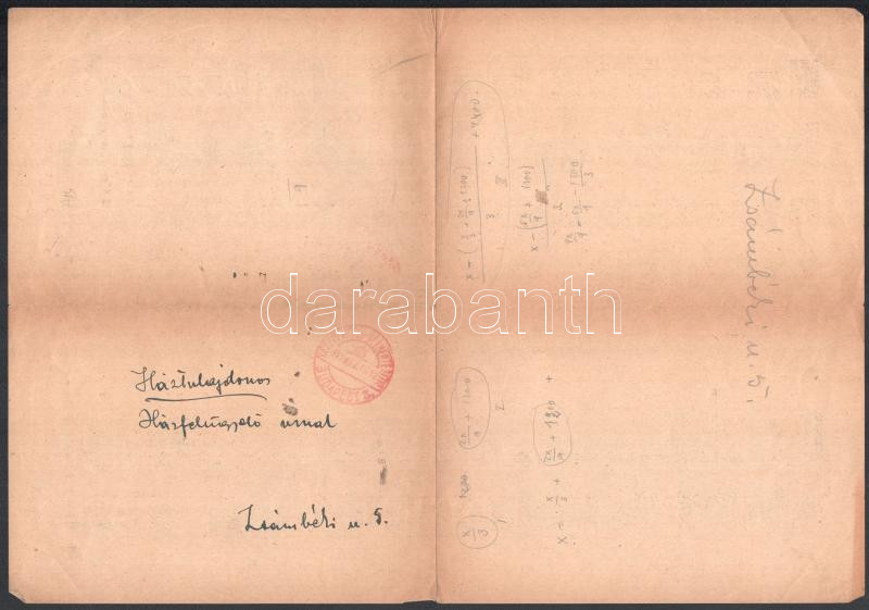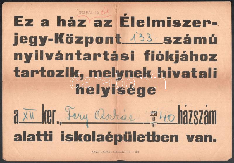 1942 "Ez a ház 1942. máj. 19-től az Élelmiszerjegy-Központ 133. számú nyilvántartási fiókjához tartozik, melynek hivatali helyisége a XII. ker., Fery Oszkár út 40. házszám alatti iskolaépületben van." Hirdetmény, levélként feladva, 30x21 cm