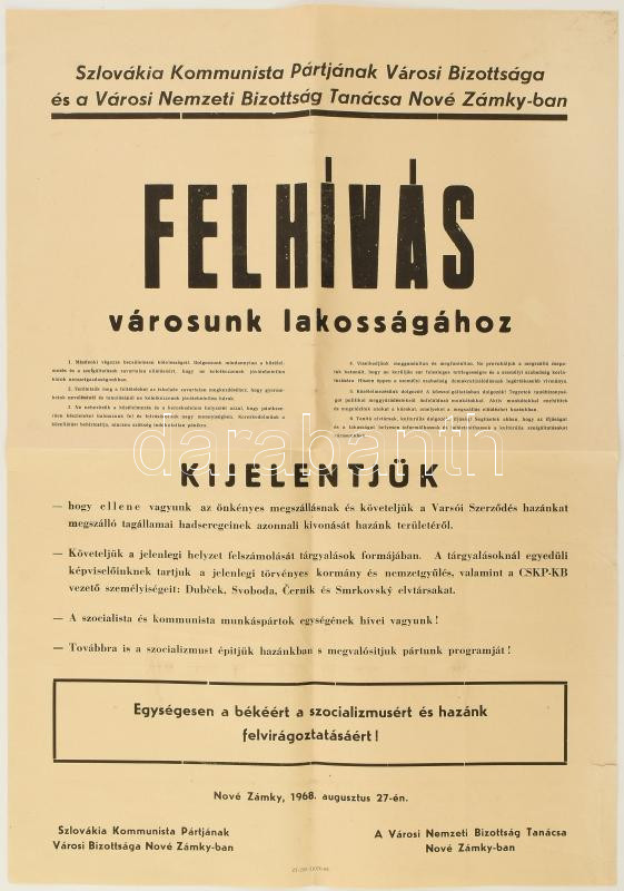 1968 Érsekújvár (Nové Zámky), az önkényes megszállás elleni, a lakossá... https://www.darabanth.com/de/447-Fernauktion/447.0/Kunst-Dokumente-andere-Sammelgebiete/Drucksachen~1500006/1968-Ersekujvar-Nove-Zamky-az-onkenyes-megszallas-elleni-a-lakossaghoz-intezett-felhC3~II2962616