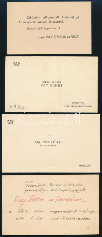 cca 1920-40 vajai Vay főnemesi család: 2 db névjegykártya, 1 db esküvő... https://www.darabanth.com/de/447-Fernauktion/447.0/Kunst-Dokumente-andere-Sammelgebiete/Drucksachen~1500006/cca-1920-40-vajai-Vay-fonemesi-csalad-2-db-nevjegykartya-1-db-eskuvoi-koszono-kartya-e~II2964026