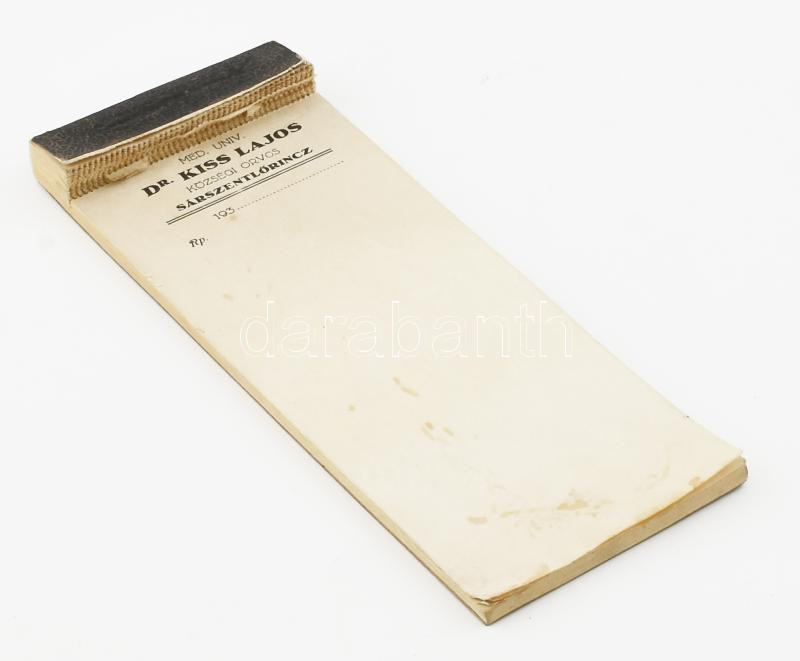 cca 1930 Dr. Kiss Lajos, községi orvos, Sárszentlőrincz, vénytömb, els... https://www.darabanth.com/de/447-Fernauktion/447.0/Kunst-Dokumente-andere-Sammelgebiete/Drucksachen~1500006/cca-1930-Dr-Kiss-Lajos-kozsegi-orvos-Sarszentlorincz-venytomb-elso-lap-kisse-foltos~II2964265