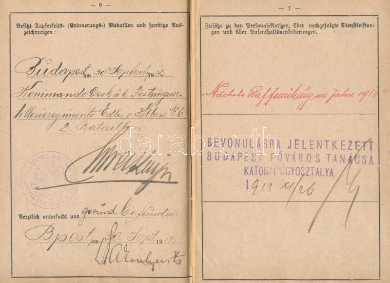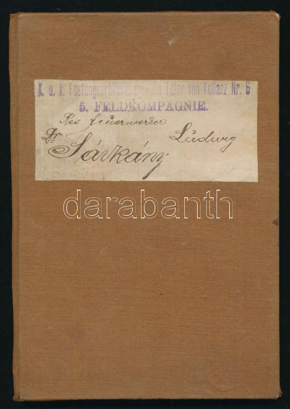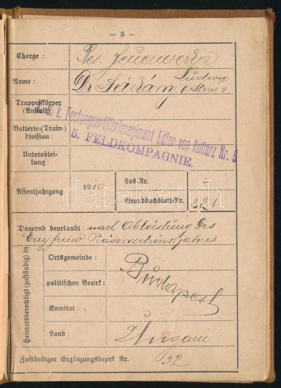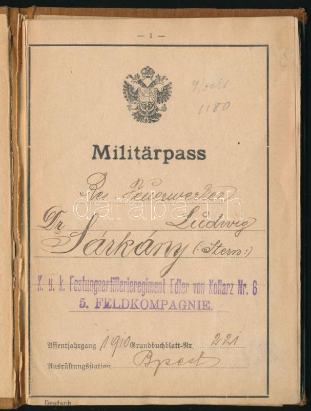 1910-1912 K. u. k. katonai igazolvány (K.u.k. Militärpass Festungsartillerie-Regiment Edler von Kollarz Nr. 6. 5. Feldkompagnie. + 1914-1917 3 db I. világháborús fotólap, 9x14 cm Dr. Sárkány (Stern) Lajos, zsidó származású személy hagyartékából.