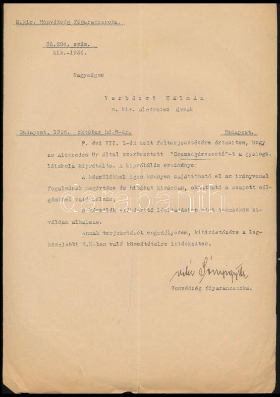 1936 Vitéz Sónyi Hugó (1883-1958) gyalogsági tábornok, a M. Kir. Honvédség főparancsnokának autográf aláírással ellátott levele, Verbőczy Kálmán (1888-1967) alezredes, a Székely Hadosztály volt zászlóaljparancsnoka részére, amelyben Verbőczy "Szemsugárvezető" nevű találmányának gyalogsági lőiskolában való sikeres teszteléséről, és lőoktatási taneszközként való terjesztésének engedélyezéséről tájékoztatja.