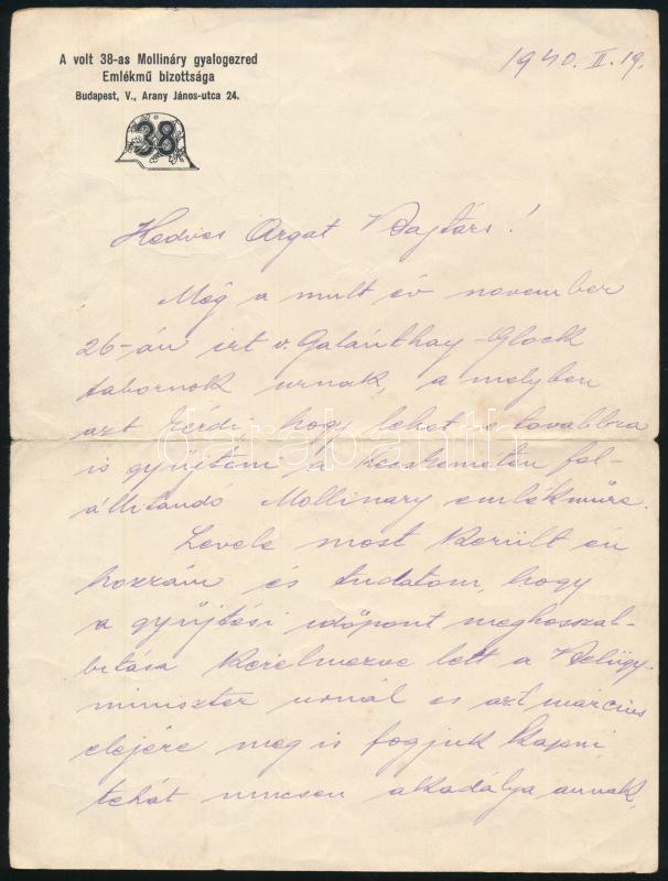 1940 A volt 38. Mollináry gyalogezred emlékmű bizottságának levele eml... https://www.darabanth.com/de/447-Fernauktion/447.0/Kunst-Dokumente-andere-Sammelgebiete/Militaria~1500001/1940-A-volt-38-Mollinary-gyalogezred-emlekmu-bizottsaganak-levele-emlekmu-allitassal-kapc~II2959089