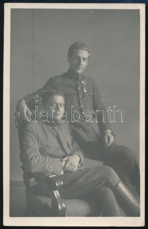 cca 1914-18 Sárdy Brutus (1892-1970) festőművész, restaurátor az I. világháború idején katonai egyenruhában, kitüntetéssel dekorálva, katonatársa körében, fotólap, 13,5x8,5 cm