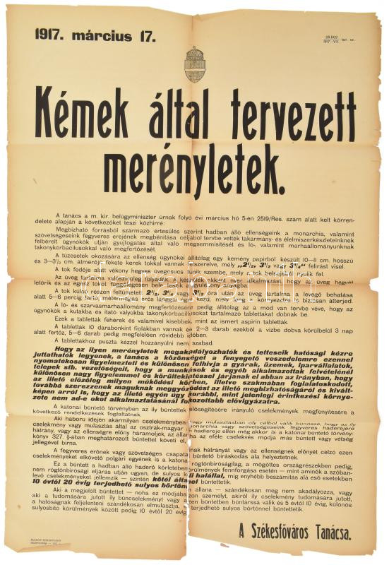 1917 "Kémek által tervezett merényletek." Budapest Székesfőváros Tanácsának hirdetménye az ellenséges ügynökök által elkövetett merényletek lehetséges módszereinek és megelőzésének tárgyában. Nagyméretű plakát, szakadásokkal, 94x63 cm