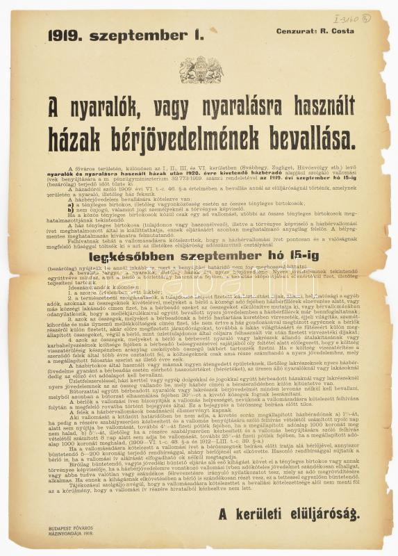 1919 "A nyaralók, vagy nyaralásra használt házak bérjövedelmének bevallása", budapesti adóügyi hirdetmény, román cenzúrával, lapszéli sérülésekkel, 47,5x33 cm