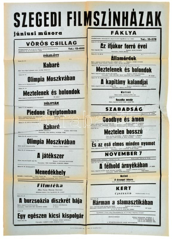 1982 Szegedi filmszínházak júniusa műsora, plakát, hajtva, kisebb gyűr... https://www.darabanth.com/de/447-Fernauktion/447.0/Kunst-Dokumente-andere-Sammelgebiete/Plakat~1500007/1982-Szegedi-filmszinhazak-juniusa-musora-plakat-hajtva-kisebb-gyurodesekkel-82x59-cm~II2959103
