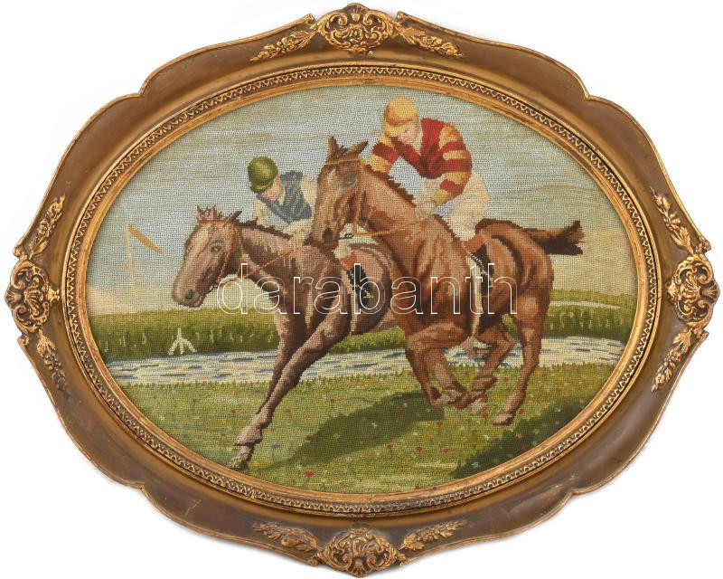 Antik historizáló, aranyozott, üvegezett fakeret, lovassport témájú szövet képpel, hátoldalán kopásokkal és korabeli képkeretező címkével, belső méret: 30×40 cm