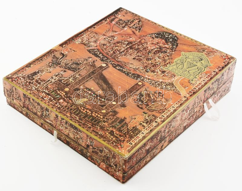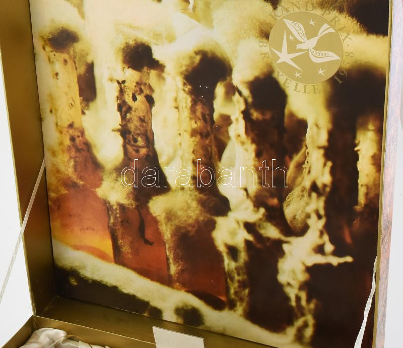 Beschreibung: Tokaji aszú díszdoboz, össz. 3 palack bontatlan 1973-as évjáratú aszú (Hungarovin Monimpex) + 6 pohár készlettel: 5 puttonyos, 4 puttonyos, 3 puttonyos és 6 db Tokaj feliratos üveg pohár, m: 8 cm, jó állapotban. Selyemmel bélelt, egyik sarkánál kissé sérült karton díszdobozban