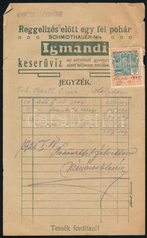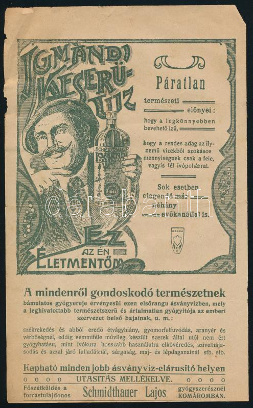 cca 1925 Igmándi Keserűvíz Számla /jegyzék / hátoldala reklámlap 19,5x... https://www.darabanth.com/de/447-Fernauktion/447.0/Kunst-Dokumente-andere-Sammelgebiete/Werbungen~2000113/cca-1925-Igmandi-Keseruviz-Szamla-jegyzek-hatoldala-reklamlap-19-5x12cm~II2963377