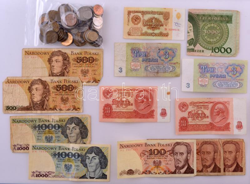 ~360g vegyes magyar és külföldi érmetétel, közte Románia, Bulgária, Ausztria, Hollandia stb. + 13db vegyes, nagyrészt szovjet és lengyel bankjegy tétel T:vegyes ~360g mixed hungarian and foreign coin lot from Romania, Bulgaria, Austria, Netherlands etc. + 13pcs of mixed banknote lot, mostly from the Soviet Union and Poland C:mixed