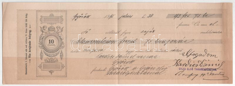 Győr 1895. "Győri Első Takarékpénztár" kitöltött váltója vízjeles papí... https://www.darabanth.com/de/447-Fernauktion/447.0/Numismatik/Notgeld-aus-Papier-und-Metall~500007/Gyor-1895-Gyori-Elso-Takarekpenztar-kitoltott-valtoja-vizjeles-papiron-TF-kis-szakad~II2944033