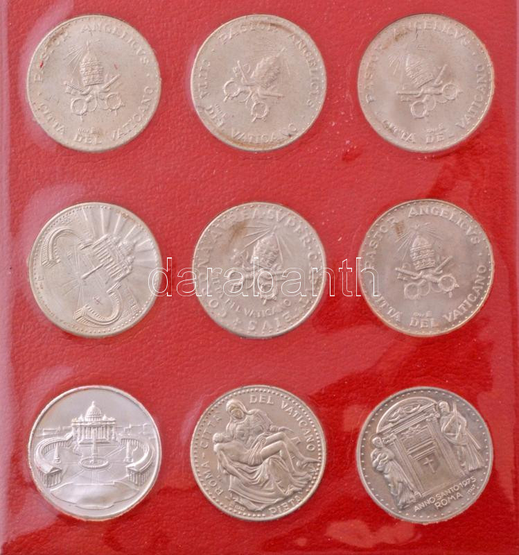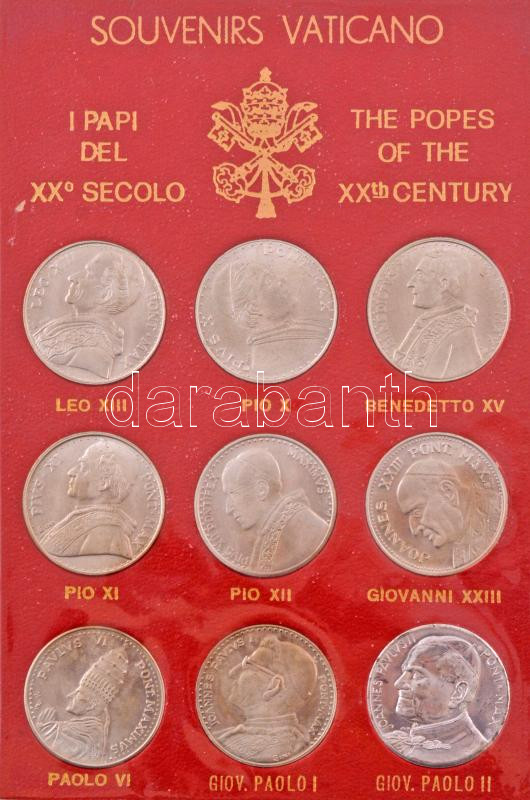 Vatikán ~1986. "Vatikánvárosi szuvenÃr" 9xklf kétoldalas, ezüstözött fém emlékérem XIII. Leó, X. Pius, XV. Benedek, XI. Pius, XII. Pius, XXIII. János, VI. Pál, I. János Pál és II. János Pál arcképeivel, eredeti műbÅ‘r tokban T:AU,XF Vatican ~1980. "Souvenir from the Vatican" 9xdiff two-sided, silvered metal medallion with the portrait of Leo XIII, Pius X, Benedict XV, Pius XI, Pius XII, John XXIII, Paul VI, John Paul I and John Paul II, in original case C:AU,XF