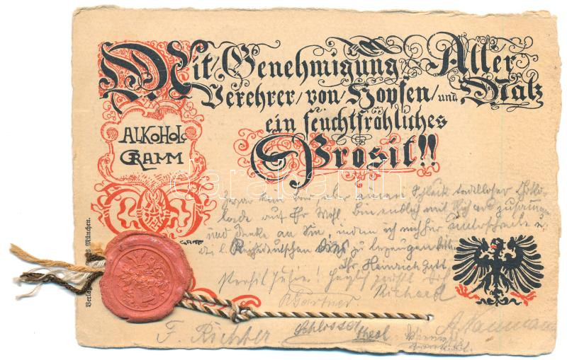 1900 Alkohol Gramm - Mit Genehmigung Verehrer von Hopfen und Malz ein feuchtfröhliches Prosit! / A komló és a maláta szerelmeseinek - Német humoros sörös lap / German humorous beer postcard (EK)