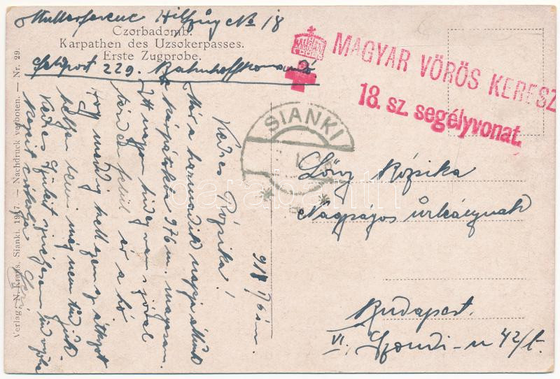 1918 Csorbadomb, Czorbadomb, Cserbin, Shcherbyn; Karpathen des Uzsokerpasses, Erste Zugprobe. N. Kraus Sianki 1917. Nr. 29. / első terheléses próba a vasúti hídon, vonat, gőzmozdony / first load test of the railway bridge, locomotive, train + "MAGYAR VÖRÖS KERESZT 18. SZ. SEGÉLYVONAT" (EB)