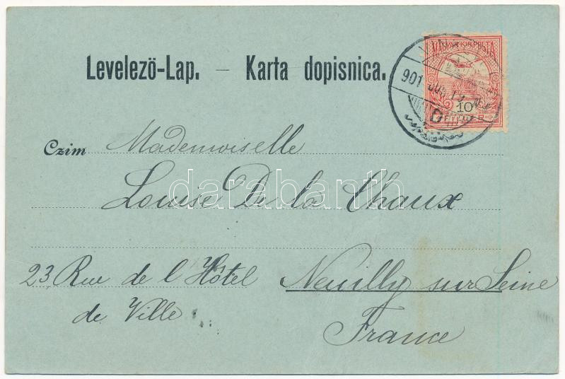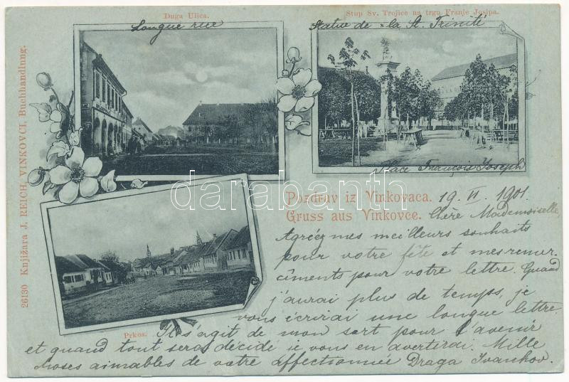 1901 Vinkovec, Vinkovac; Prkos, Duga Ulica, Stup Sv. Trojice na trgu Franje Josipa / mozaiklap, utca, szobor / multi-view postcard, street view, monument. J. Reich 26130. Art Nouveau montage, floral (fa)