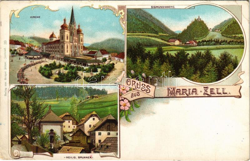 Beschreibung: 1939 Mariazell, Kirche, Sigmundsberg, Heilig. Brunnen. Gregor Fischer Art Nouveau, floral, litho (EK)