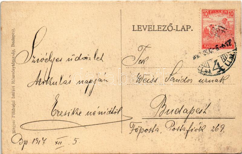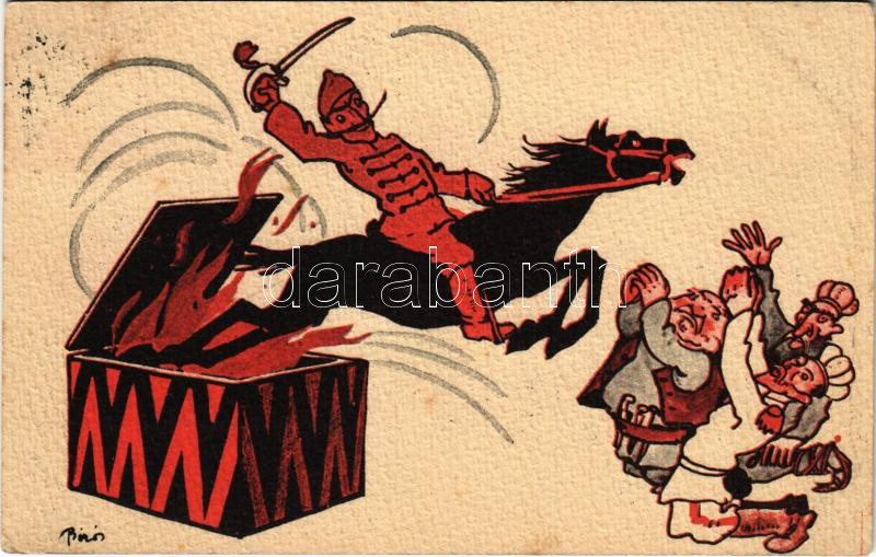 1917 Humoros világháborús grafikai lap. Magyar krampusz huszár az Antant hatalmak ellen. Kiadja a Magyar Földrajzi Intézet Rt. / Austro-Hungarian Krampus hussar. Anti-Triple Entente propaganda card s: Bíró