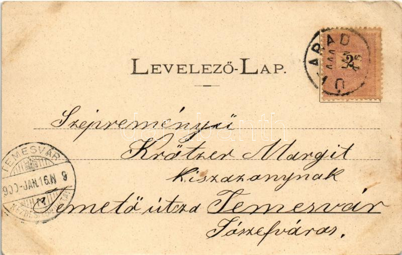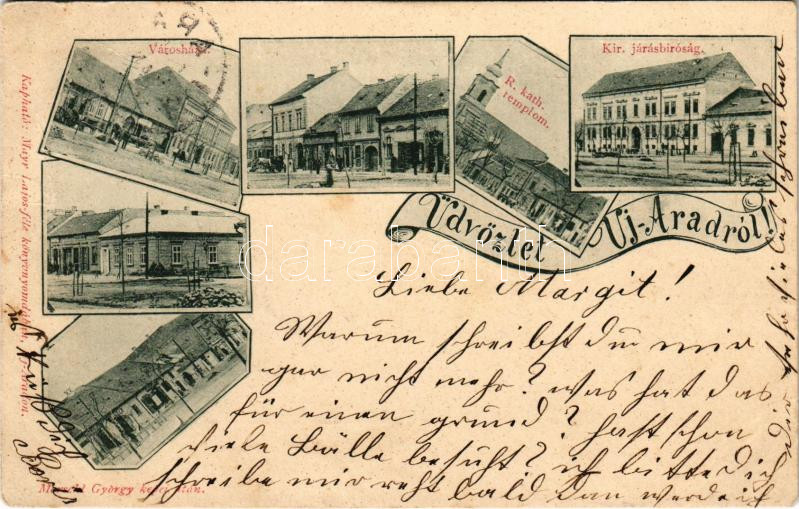 1900 Arad, Újarad, Új-Arad, Aradul Nou; Városháza, Római katolikus templom, Kir. Járásbíróság, üzletek. Mayr Lajos kiadása / town hall, Catholic church, district court, shops. Art Nouveau (EK)