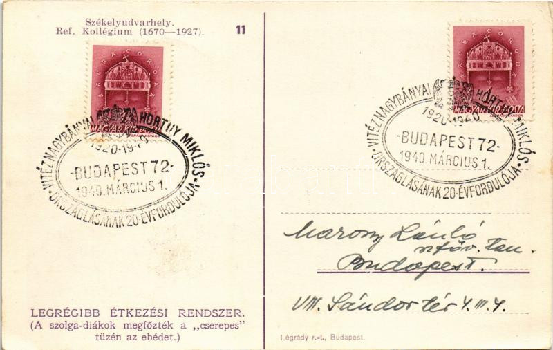 Beschreibung: Székelyudvarhely, Odorheiu Secuiesc; Református Kollégium (1670-1927) 11., legrégebbi étkezési rendszer. Légrády rt. kiadása / tradition of the Calvinist boarding school + "1920-1940 Vitéz Nagybányai Horthy Miklós országlásának 20. évfordulója" So. Stpl (EK)