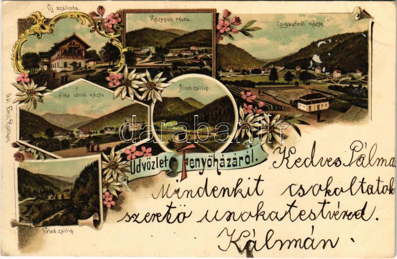 1897 (Vorläufer!) Fenyőháza, Lubochna; Új szálloda, Ilka útról nézve, Csigaútról nézve, Középső rész, Alsó zsilip, Felső zsilip / hotel, dam, villa, spa. Art Nouveau, floral, litho (EK)