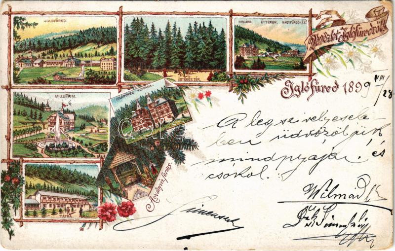 1899 (Vorläufer) Iglófüred, Spisská Nová Ves Kupele, Novovesské Kúpele; Üstökös tér, Hungária szálló, Millennium, Tátra szálló, villa, étterem, nagy fürdőház, ásványvíz forrás / square, hotels, villas, restaurant, bathhouse, spring source, spa. Art Nouveau, floral, litho (EM)