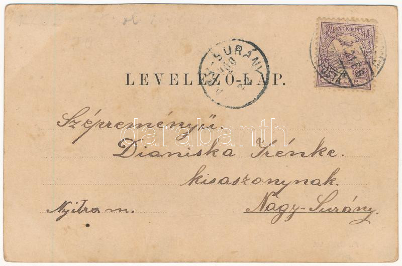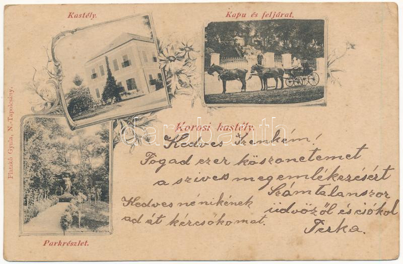 1900 Nyitrakoros, Koros, Krusovce (Nagytapolcsány, Topolcany); kastély, kapu és feljárat, park, lovashintó. Platzkó Gyula kiadása / castle gate and park, horse chariot. Art Nouveau, floral (vágott / cut)