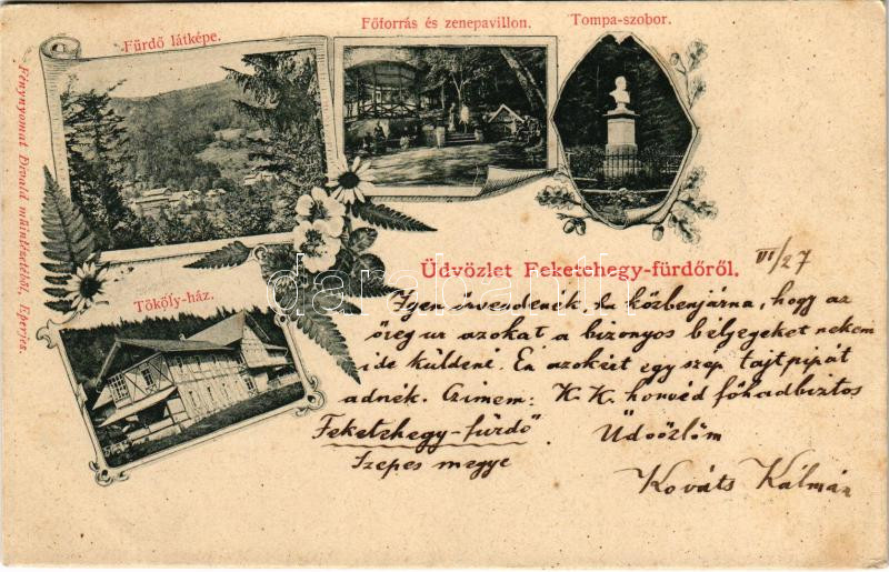 1901 Feketehegyfürdő, Feketehegy, Cernohorské kúpele (Merény, Vondrisel, Nálepkovo); főforrás, zenepavilon, Tompa szobor, Tököly ház. Fénynyomat Divald műintézetéből / spring, music pavilion, statue, villa. Art Nouveau, floral (fl)