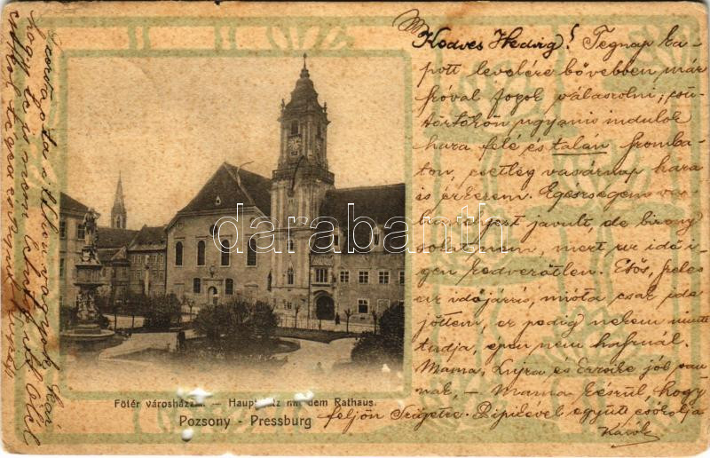 1902 Pozsony, Pressburg, Bratislava; Fő tér, Városháza. Holderer Guszt... https://www.darabanth.com/de/448-Fernauktion/448.0/Ansichtskarten/Slowakei~1500007/1902-Pozsony-Pressburg-Bratislava-Fo-ter-Varoshaza-Holderer-Gusztav-kiadasa-Hauptplatz-~II2964681