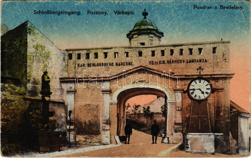 1923 Pozsony, Pressburg, Bratislava; Schloßbergeingang, K.u.K. Schlossberg Kaserne / Várkapu, Cs. és kir. Várhegy laktanya, óra, katonák / castle gate, K.u.K. military barracks on the castle hill, soldiers, clock (kopott élek /worn edges)