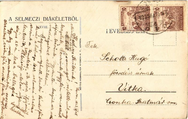 1923 Selmecbánya, Schemnitz, Banská Stiavnica; A selmeci diákéletből XVIII. Fiúk! Ha majd remeg kezemben... Kiadja a Röttig-Romwalter nyomda rt. Sopron, Studentika / Hungarian Studentica art postcard s: Bartha L. (EK)