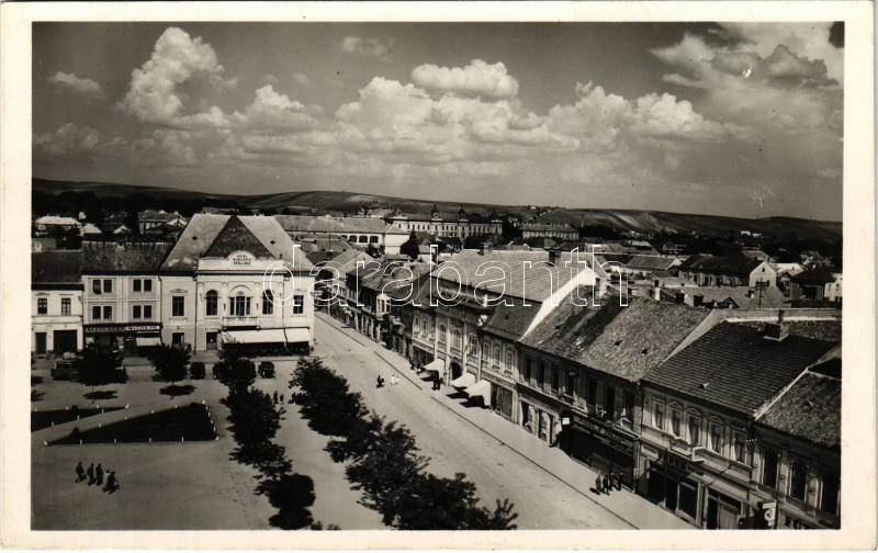 1941 Rimaszombat, Rimavská Sobota; Horthy Miklós tér, Hungária szálloda, kávéház és étterem, Klein Géza és Melczer Pál, Veres Ignác, Engel Zoltán Csillag áruház, Telesznicky Ferenc üzlete. Marosi József kiadása / square, shops, hotel, cafe and restaurant