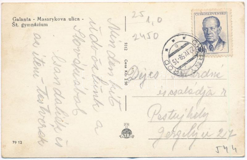 1958 Galánta, Masarykova ulica, gymnázium / Masaryk utca, Állami gimná... https://www.darabanth.com/de/448-Fernauktion/448.0/Ansichtskarten/Slowakei~1500007/1958-Galanta-Masarykova-ulica-gymnazium-Masaryk-utca-Allami-gimnazium-street-view-gramma~II2964705