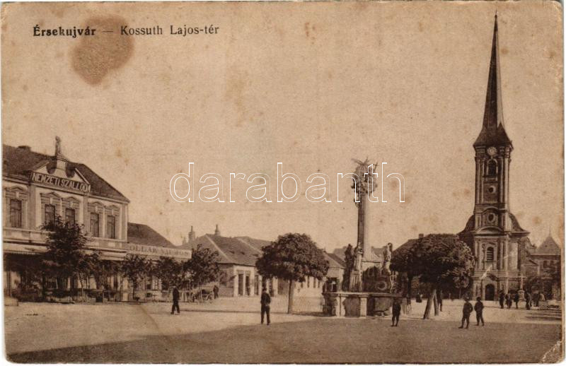 Érsekújvár, Nové Zámky; Kossuth Lajos tér, Szentháromság szobor, templom, Nemzeti Szálloda, Pollák Vilmos üzlete. Vasúti levelezőlapárusítás 178. / square, Trinity statue, church, hotel, shop (Rb)