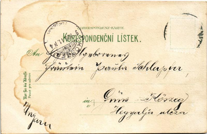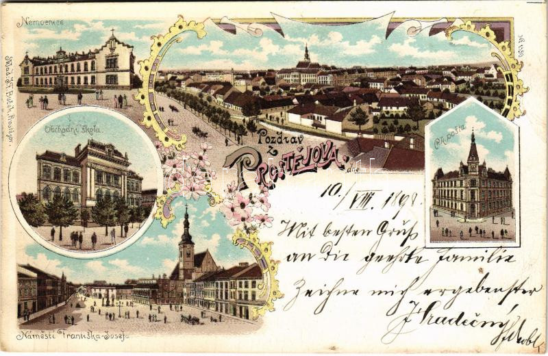 1898 (Vorläufer) Prostejov, Nemocnice, Obchodni skola, Námesti Frantiska Josef, C.k. posta / hospital school, square, post office. J. F. Bucek Art Nouveau, floral, litho (fl)