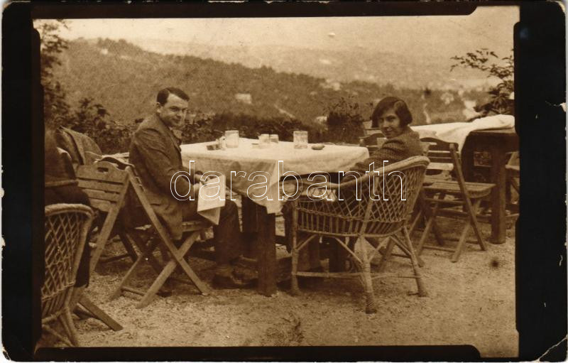 Beschreibung: 1927 Budapest XII. Zugliget, étterem terasz, italozó pár, photo (EK)